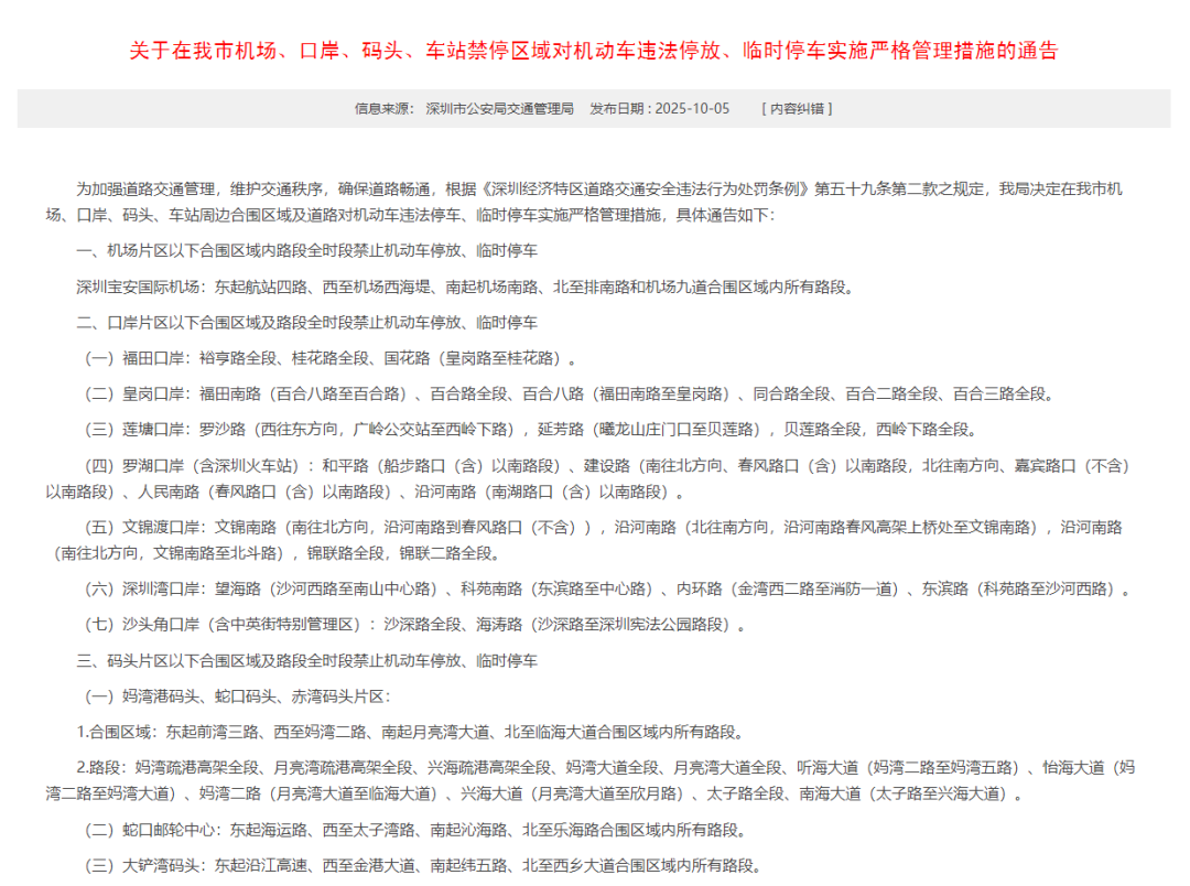 为加强道路交通管理,维护交通秩序,确保道路畅通,根据《深圳经济特区道路交通安全违法行为处罚条例》第五十九条第二款之规定,我局决定在我市机场、口岸、码头、车站周边合围区域及道路对机动车违法停车、临时停车实施严格管理措施,具体通告如下:
