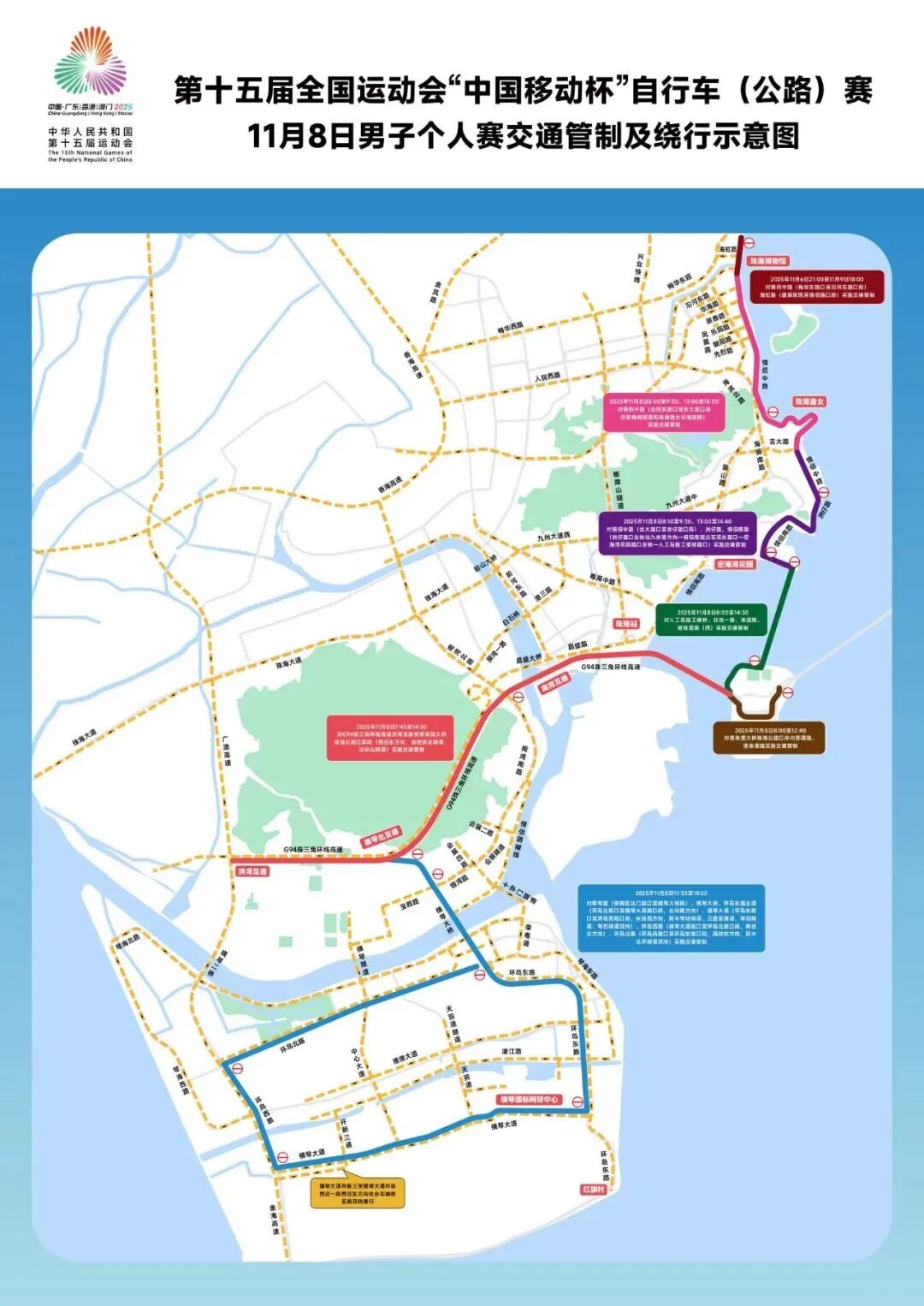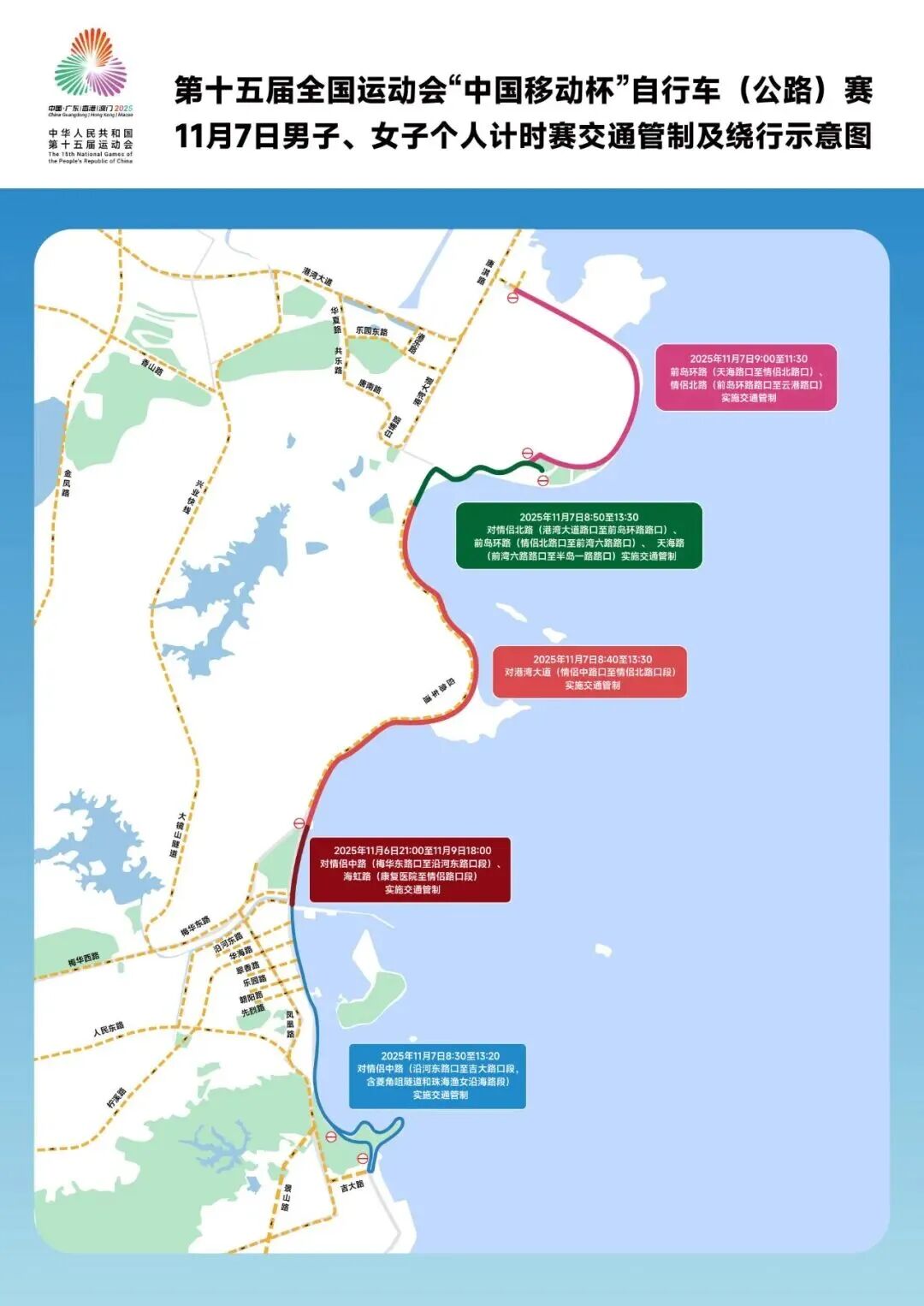 管制路段①:对情侣中路(沿河东路口至吉大路口段,含菱角咀隧道和珠海渔女沿海路段)实施交通管制。