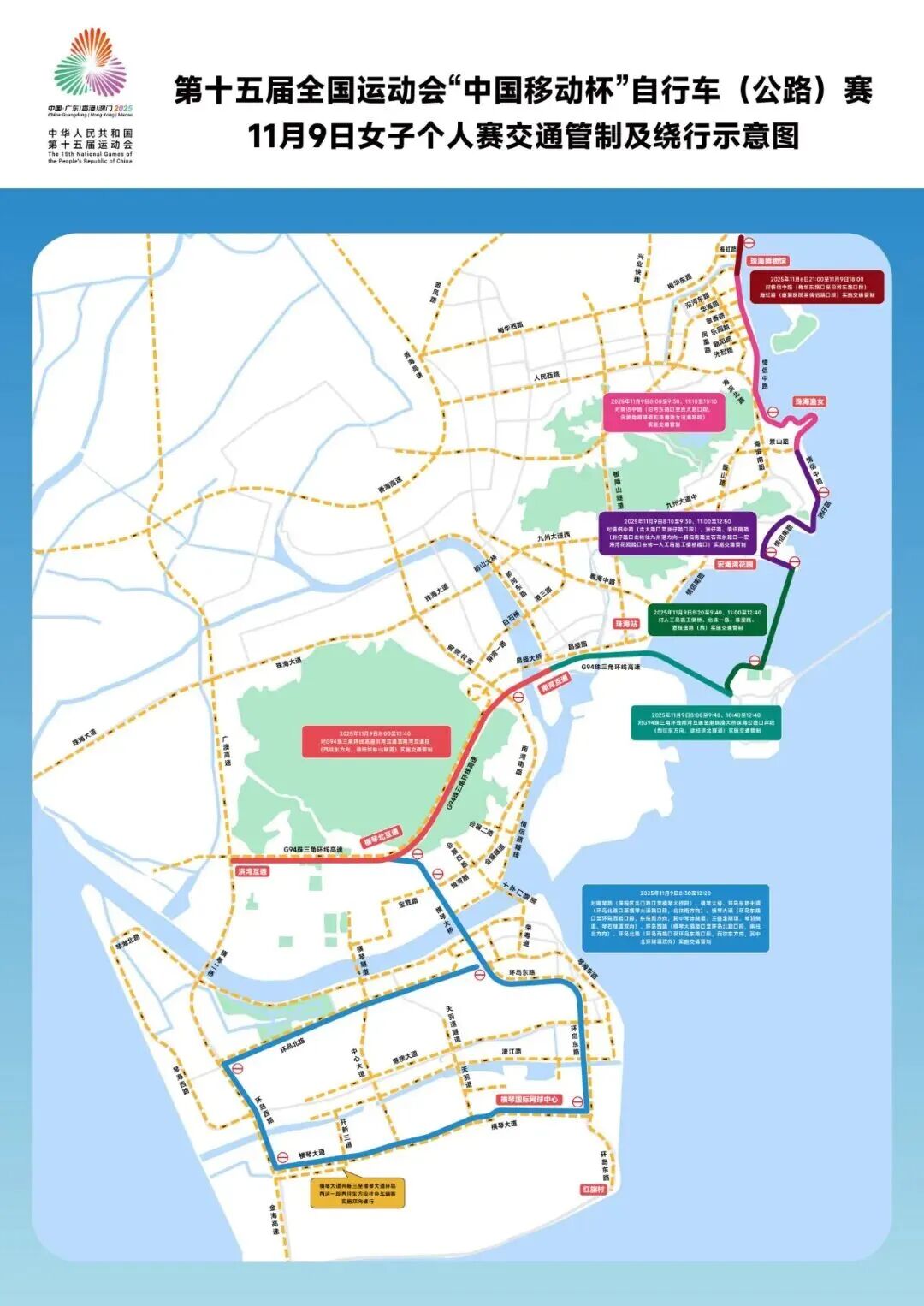 管制路段⑥:对南琴路(保税区北门路口至横琴大桥段)、横琴大桥、环岛东路主道(环岛北路口至横琴大道路口段,北往南方向)、横琴大道(环岛东路口至环岛西路口段,东往西方向,其中琴诗隧道、三叠泉隧道、琴羽隧道、琴石隧道双向)、环岛西路(横琴大道路口至环岛北路口段,南往北方向)、环岛北路(环岛西路口至环岛东路口段,西往东方向,其中北环隧道双向)实施交通管制。