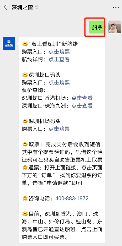 微信搜索或扫描文末二维码,关注【深圳之窗】公众号,对话框发送关键词【船票】即可获取深圳蛇口码头及深圳机场码头等最新航线动态、购票入口及票价查询入口。