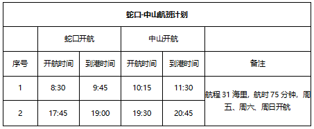 接船公司通知,拟于2020年7月3日开通深圳蛇口-中山水上客运航线,航班时间如下: