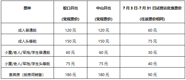 接船公司通知,拟于2020年7月3日开通深圳蛇口-中山水上客运航线,现票价和航班时间如下: