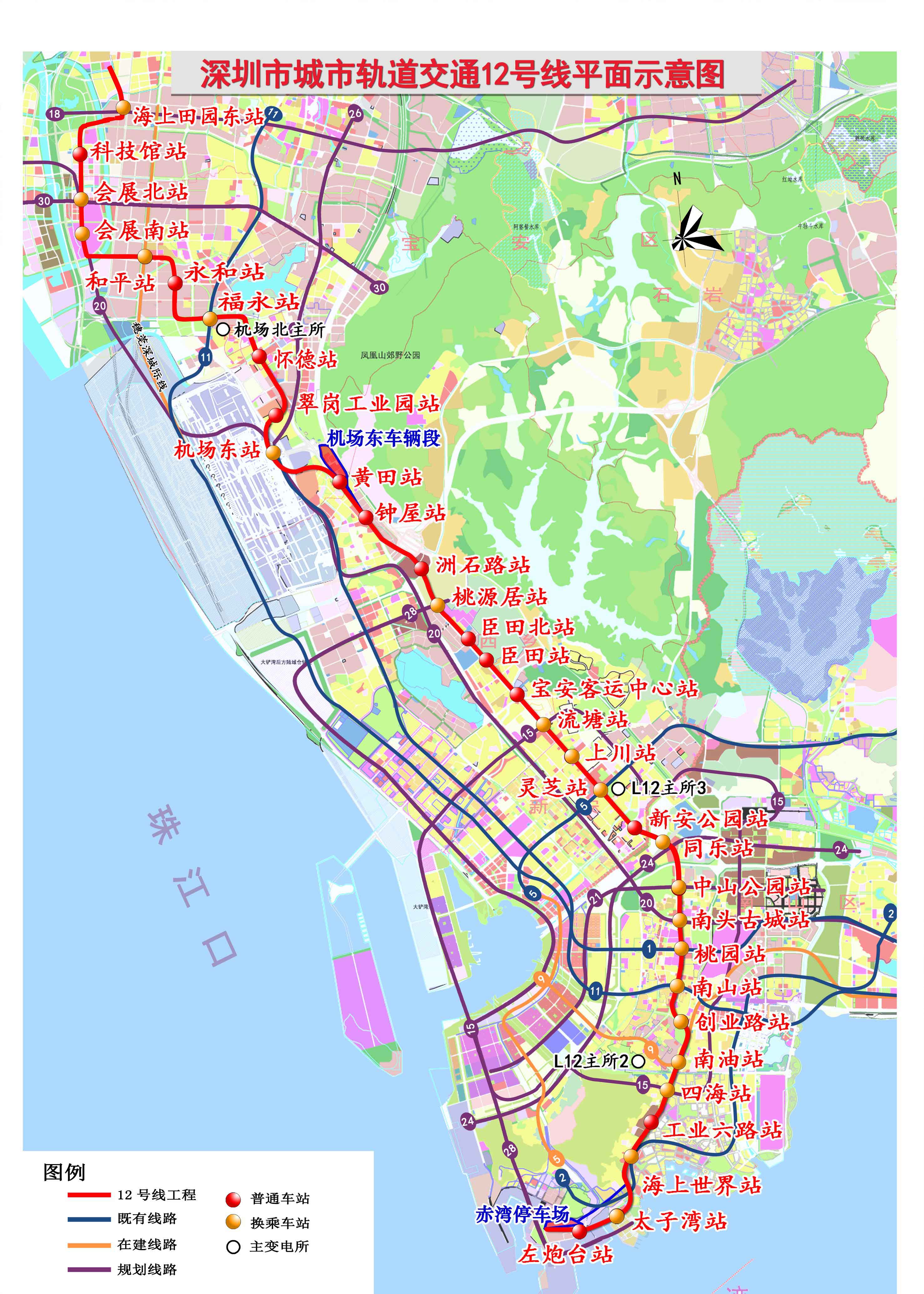 深圳市城市轨道交通12号线工程线路起自左炮台站,终至海上田园东站,线路经过南山和宝安两个行政区,线路全长40km,全线采用地下敷设方式,设站33座,其中18座位换乘站,平均站距1.39km。