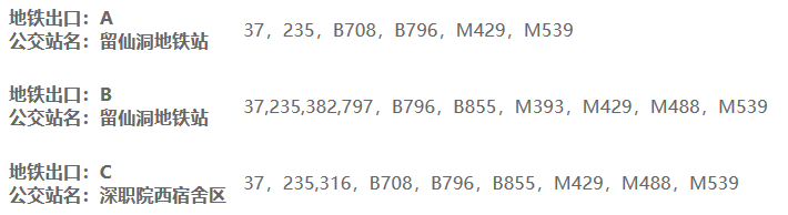 | C 出口: | 留仙大道北侧、同发路西侧、高职院西校区、留仙洞大厦、留仙小学、留仙洞村委会、留仙一村、蓝天花园、深圳实验学校 |