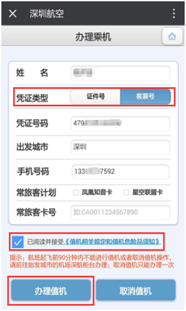 a.输入乘机人信息以及手机号,阅读并勾选值机协议,点击“办理值机”;