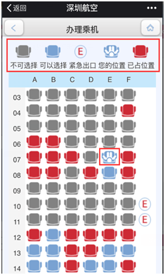 d.值机座位图页面,选择蓝色可选择的座位,点击“值机”;