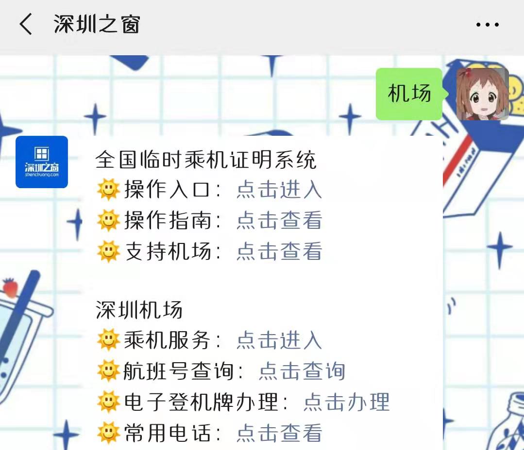 搜索或扫描文末二维码,关注【深圳之窗】公众号,对话框回复关键词【机场】,即可获取机场常用电话、电子登机牌办理、航班号查询等相关信息