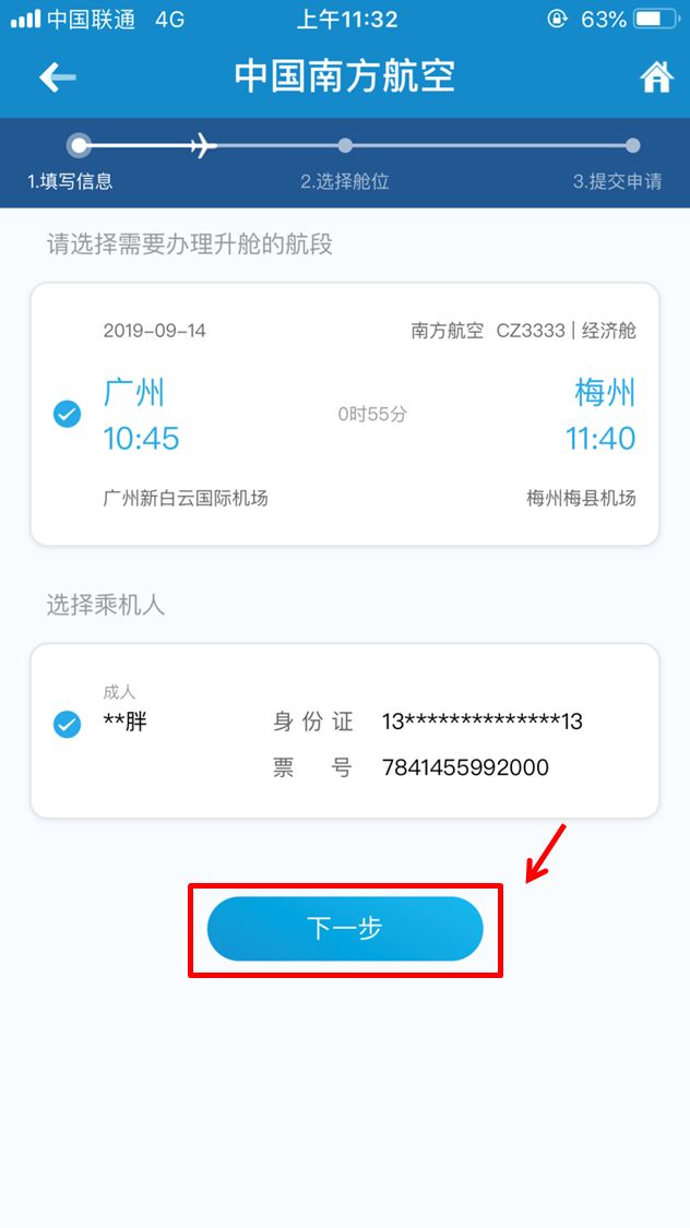 选择需要办理升舱的航段后,点击“下一步”