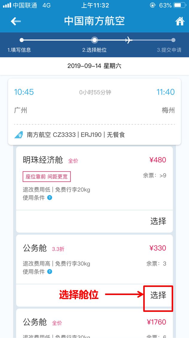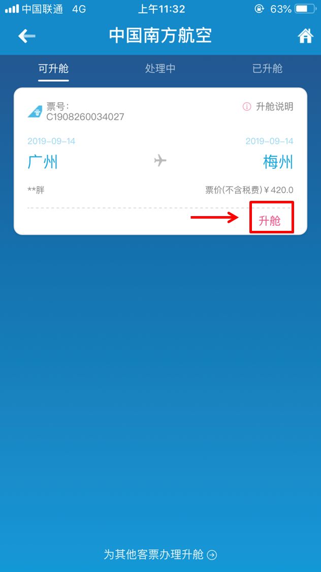 选择航班,点击“升舱”