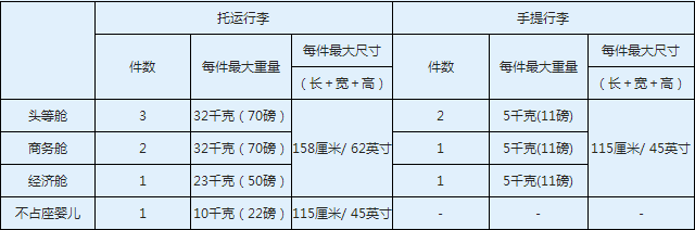 头等舱乘客免费行李托运额为40kg,商务舱为30kg,经济舱为20kg。托运行李每件最大重量不能超过50kg,超出免费行李限额的部分,还是需要另外付费的哦。
