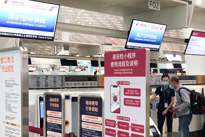 快线旅客在“易安检”小程序认证及预约后,可选择“易安检”智能安检通道,体验全流程自助安检,不用取出包里的电脑、雨伞,更安全、更高效、更简易,让您的旅途更舒适。