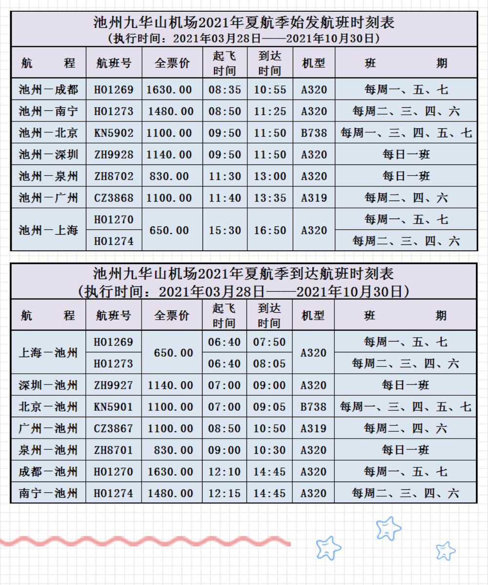附池州九华山机场2021夏航季始发和到达航班时刻表