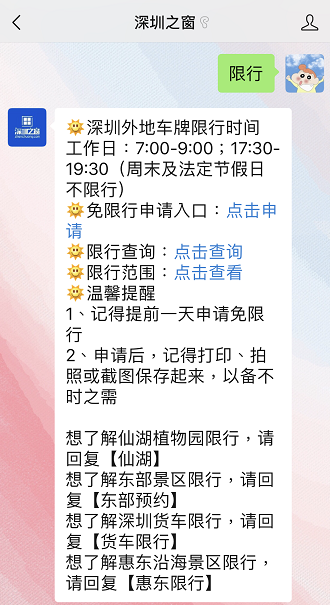 关注【深圳之窗】微信公众号,后台回复关键词【限行】,即可获取深圳限行申请、查询及范围入口