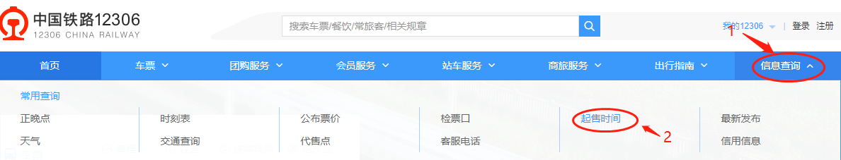 (1)打开12306.cn,将鼠标移到“信息查询”处,点击“起售时间”。