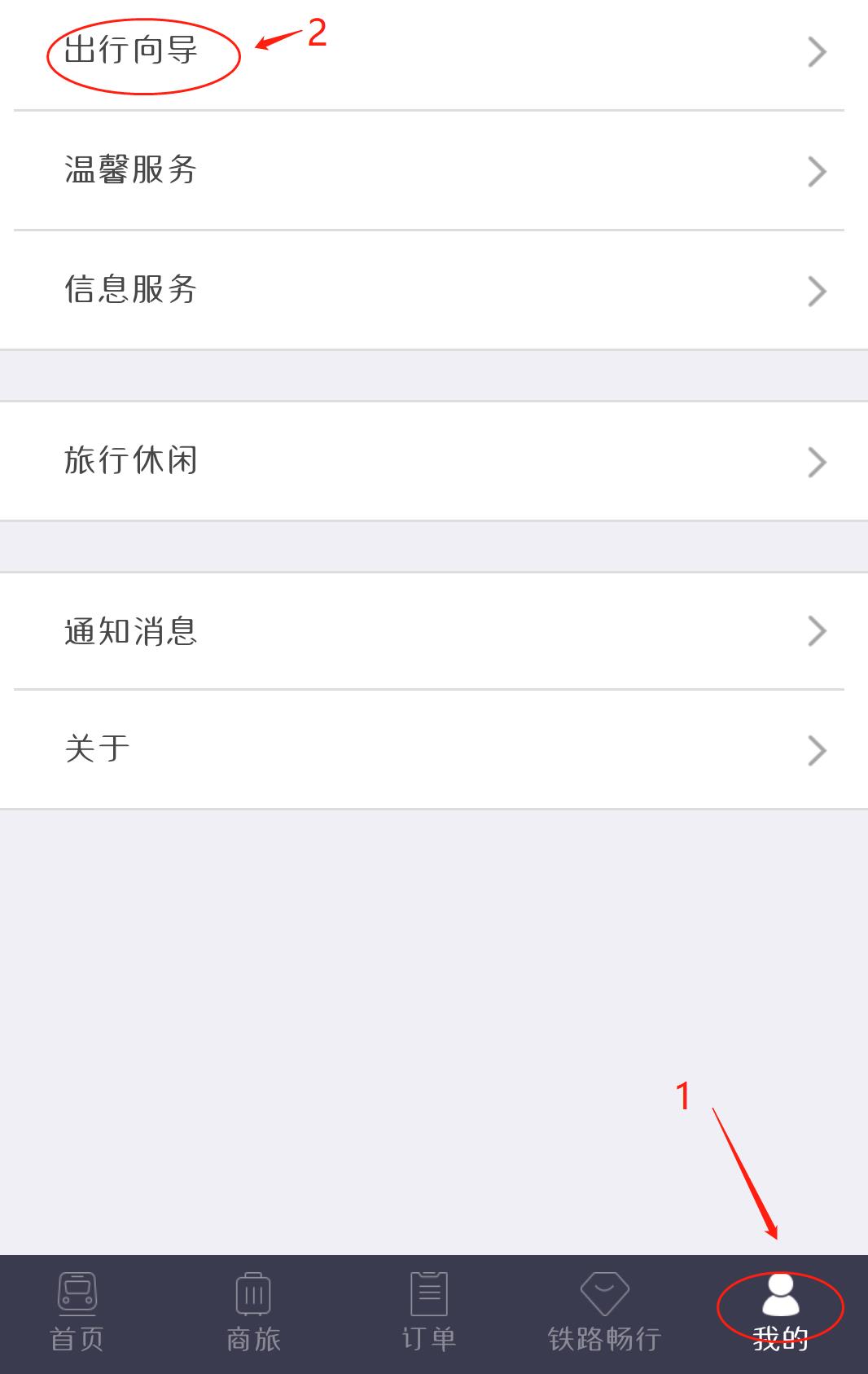 (1)打开“铁路12306”APP,点击“我的”,点击“出行向导”。