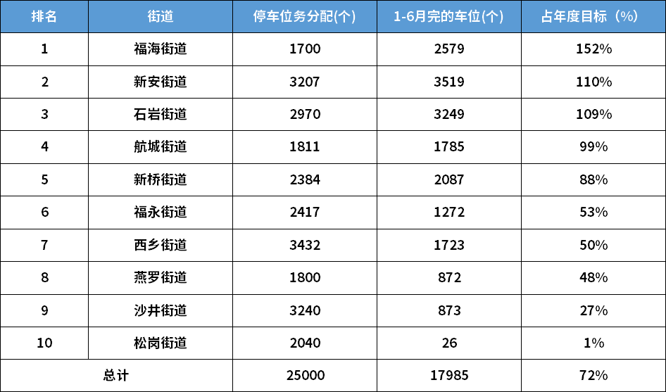 2022年,宝安区将新增各类停车泊位2.5万个,目前已新增17985 个车位,完成进度72%。