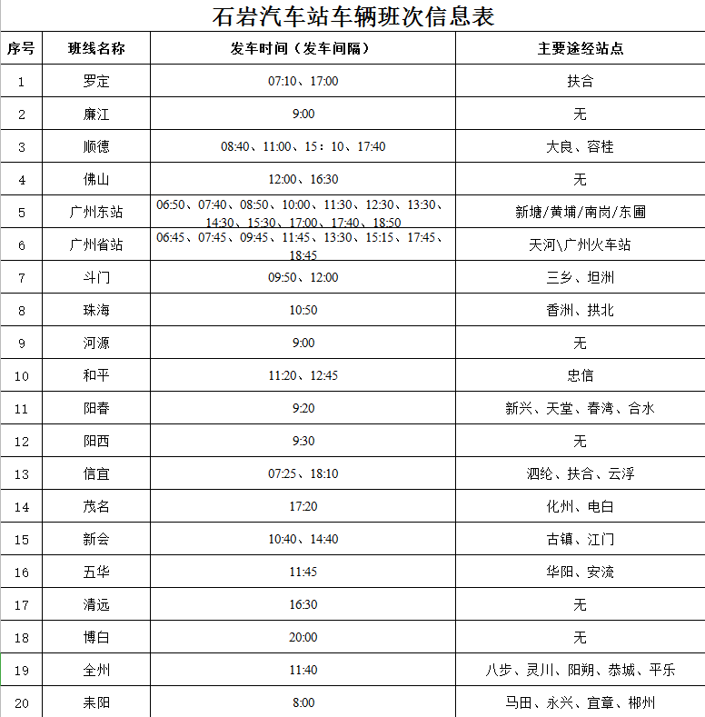 2020国庆节期间深圳石岩汽车站车辆班次信息