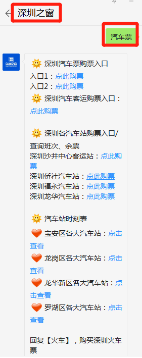 微信搜索或扫描文末二维码,关注【深圳之窗】微信公众号,对话框回复关键词【汽车票】即可获取2021深圳各大汽车站购票入口以及深圳各大车站到全国各城市时刻表,班次余票查询等信息;发送【核酸】可获取深圳部分医院核酸检测预约入口。